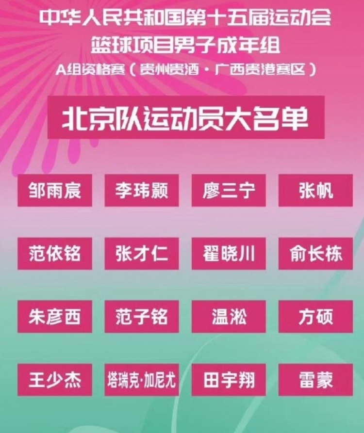 5月28日讯 第十五届全运会篮球男子成人组运动员大名单公布,北京队由北京男篮和北控男篮为班底组建。