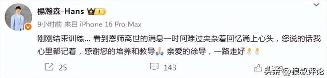杨瀚森发文送别恩师:刚刚结束训练… 看到恩师离世的消息一时间难过夹杂着回忆涌上心头,您说的话我心里都记着,感谢您的培养和教导[祈祷] 亲爱的徐导,一路走好。根据此前的媒体报道,青岛国信签下杨瀚森的计划当中,徐长锁一度三顾茅庐,与杨瀚森父母开出承诺希望能培养成为NBA级别的球员。今年夏天,毫无疑问是兑现了承诺,杨瀚森也成为徐长锁过去很长一段时间最为得意的弟子之一。