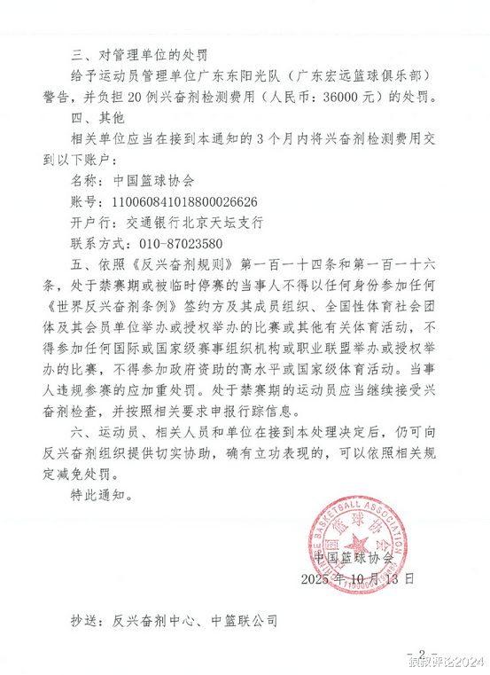 CBA山东高速俱乐部主力球员遭遇的尿检风波1月10日有了定论,中国篮协根据相关事实,对其免予禁赛,但仍然给予球员本人和俱乐部相关人员罚款和警告处罚。