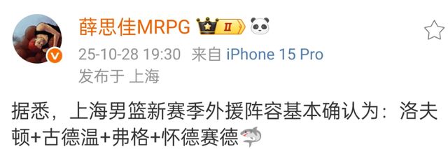 上海男篮休赛期大手笔引进了张镇麟,还补充了崔晓龙,外援方面签下了古德温,续约了洛夫顿。但随后两名外援的挑选就没有了下文,在日本热身赛期间,试训了怀特塞德,不过当时效果不理想,之后又接触了多名有CBA经历的外援。就在距离CBA新赛季还有不到两个月的时候,上海男篮终于确定了四名外援,弗格的加盟有些意外,据了解卢伟希望弗格的经验给球队提供帮助,而怀特塞德的内线防守还是上海男篮所需要的。