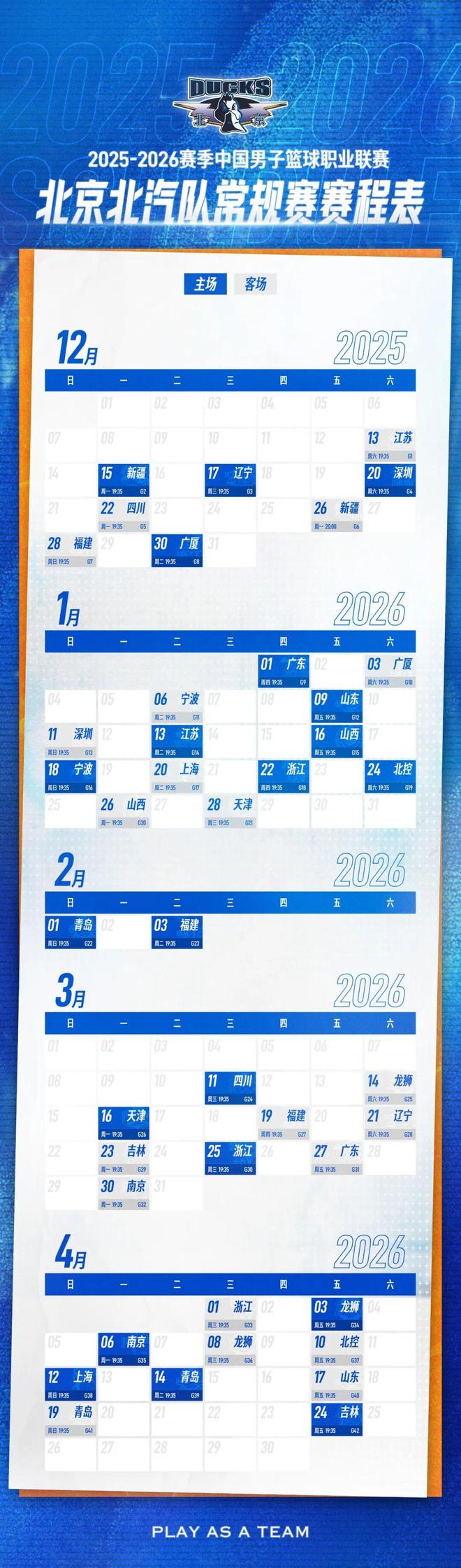 主场首秀战新疆,元旦大战迎广东,京城德比引爆新春。25-26赛季CBA战火重燃,北京北汽男篮将于12月13日吹响冲锋号角,首轮客场挑战江苏男篮,12月15日坐镇主场迎战新疆,历经42轮常规赛鏖战(主客场各21轮),向更高目标发起冲击。全新征程,战意沸腾,北京北汽男篮必将全力以赴,以无畏之姿书写全新篇章!速速锁定赛程,与球队共赴热血之约。主场和票务信息将陆续公布,请继续关注我们的相关报道。