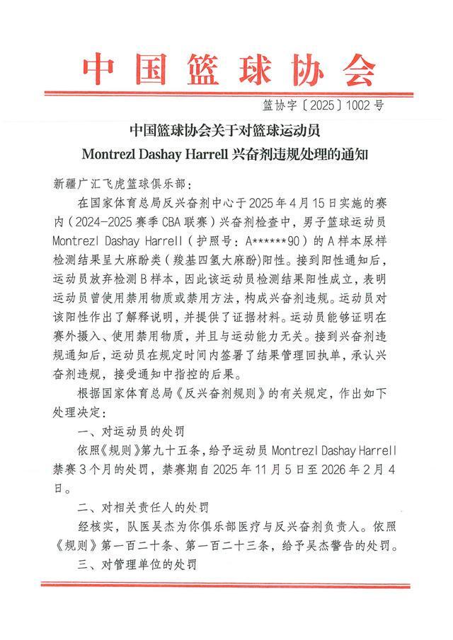 根据公告中的内容,哈雷尔的A样本尿样检测结果呈大麻酚类(羧基四氢大麻酚)阳性。接到阳性通知后,运动员放弃检测B样本,因此该运动员检测结果阳性成立,表明运动员曾使用禁用物质或禁用方法,构成兴奋剂违规。运动员对该阳性作出了解释说明,并提供了证据材料。运动员能够证明在赛外摄入、使用禁用物质,并且与运动能力无关。接到兴奋剂违规通知后,运动员在规定时间内签署了结果管理回执单,承认兴奋剂违规,接受通知中指控的后果。新疆男篮队医吴杰作为俱乐部医疗与反兴奋剂负责人,被给予警告的处罚。