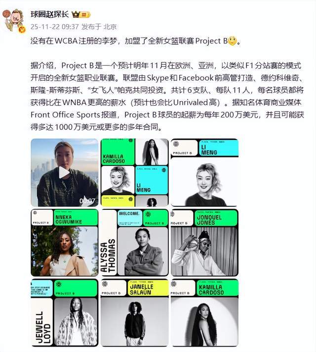 一时间,丈二和尚摸不着头脑,这Project B是什么鬼?根据球圈赵探长随后的解释,我们能够了解到,Project B是一个预计明年11月在欧洲、亚洲,以类似F1分站赛的模式开启的全新女篮职业联赛。联盟由Skype和Facebook前高管打造、德约科维奇、斯隆-斯蒂芬斯、“女飞人”帕克共同投资。该赛事共计6支球队、每队11人,每名球员都将获得比在WNBA更高的薪水(预计也会比Unrivaled高)。据知名体育商业媒体Front Office Sports报道,Project B球员的起薪为每年200万美元,并且可能获得多达1000万美元或更多的多年合同。