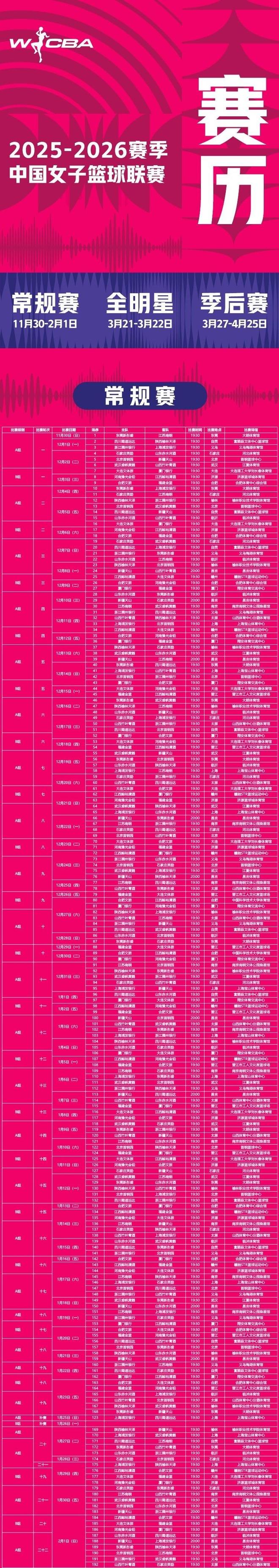 WCBA全明星赛将在3月21-22日进行,季后赛则是3月27日拉开帷幕,半决赛采取3场2胜制,总决赛采取5场3胜制,最晚在4月25日产生总冠军。