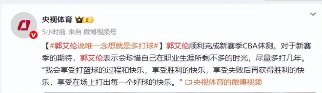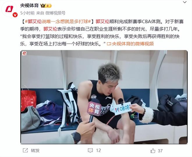 02、央视发文11月24日,央视体育以“郭艾伦说唯一念想就是多打球”为题。发布了他在CBA体测现场的采访视频,让我们看到了他最真实的状态。