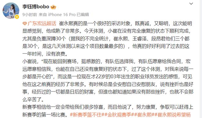 美女记者李钰博在采访了崔永熙后盛赞小崔既真诚又聪明,明显感觉小崔成熟了很多。她写道:小崔在没有完全康复的情况下顺利完成体测,这一年他真的没有浪费,这位22岁的球员发出最真挚的感悟,可见他之前真的经历非常多。