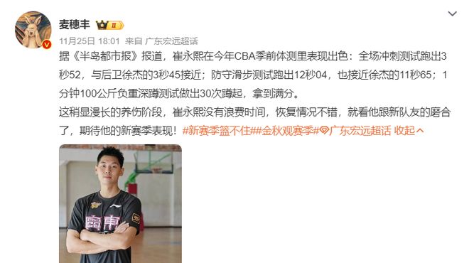 崔永熙在2024年12月12日遭遇了左膝前交叉韧带撕裂大伤,随后他被篮网队裁掉,重返CBA后被广州交易至广东,还剩16天他就已经足足1年时间没有打过正式比赛,一天之前他刚刚完成了CBA的体测。
