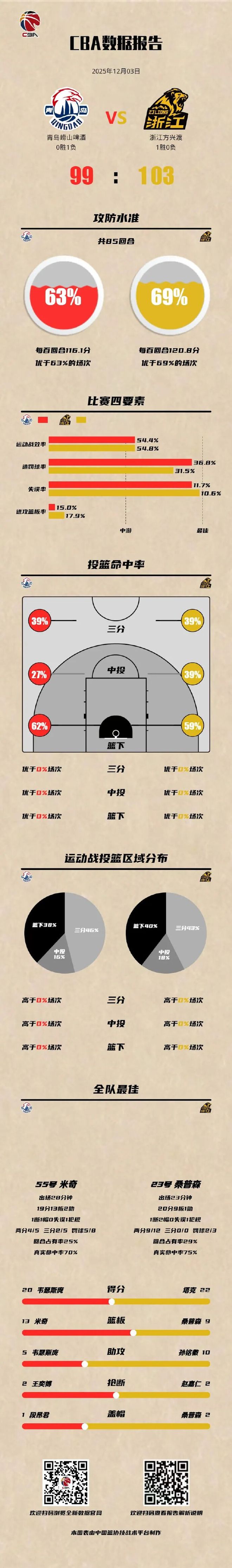 CBA俱乐部杯赛北京时间2025年12月3日,第二届中国人寿·CBA俱乐部杯小组赛拉开战幕,青岛崂山啤酒迎战劲敌浙江方兴渡。比赛开局,双方你来我往,第二节后半程青岛崂山啤酒团队协作、立足防守,连续得分,将比分反超。进入下半场,浙江方兴渡调整状态、保持领先,战到最后,青岛崂山啤酒追分未果,最终99-103遗憾输掉比赛。