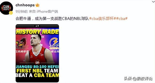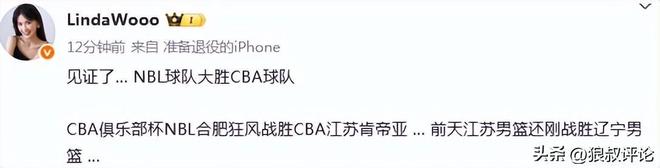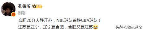媒体人“LindaWooo”发文点评“见证了, NBL球队大胜CBA球队CBA俱乐部杯NBL合肥狂风战胜CBA江苏肯帝亚 … 前天江苏男篮还刚战胜辽宁男篮”。