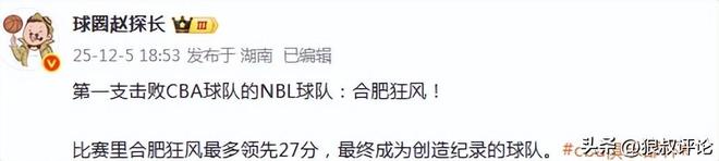 北京时间12月5日,CBA杯赛继续开打,合肥狂风100-80击败江苏肯帝亚。成为NBL球队当中,首支在正规比赛击败CBA球队的队伍,创造历史性时刻。数据:合肥:阿格拉瓦尼斯25分8板2助2帽、哈德森23分11板3助3断、麦考伊15分4板3助、刘子豪10分2助、张稀然6分2板7助江苏:爱德华兹16分4板2助、庞峥麟16分2板6助、亨特13分6板3助、贾尔斯11分2板、刘正清10分4板1助、马国栋5分、郑祺龙4分3板、闫实3分、肖恺2分、刘泽希3板2助、吴羽佳2板。本场比赛的结果也引发外界的热议。