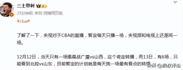 北京时间12月10日,根据媒体人三土带刺的发文报道,央视对于CBA的直播,暂定每天只播一场,央视频和电视上还是同一场。12月12日,当天只有一场揭幕战广厦vs山西,这个肯定转播,而13日,有6场,只能看到北控vs山东,目前暂定的计划就是每天挑一场最有看点的转播。
