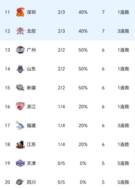 从以上积分榜来看,北京队、广东队继续保持全胜,辽宁队、广厦队都是4胜1负,分列第三、第四,另外全败的球队仅剩天津队、四川队,江苏队已经拿到了首场胜利。作为昔日的总冠军,四川队本轮比赛遭遇51分的惨败,继续沦为垫底位置。