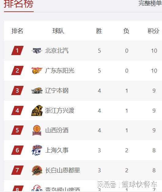 目前,积分榜榜首属于北京队,他们已经取得了5胜0负的战绩,以一波5连胜,独占鳌头。广东队则紧跟其后,他们这一轮比赛的对手是广州队,广东队最终以93-85击败了广州队,成功拿下赛季第5胜。凭借着这一波5连胜,广东队继续紧追北京队,排在积分榜第2名。值得一提的是,截止到目前,CBA全联盟中,也就只剩下北京队和广东队,他们暂时保持不败金身,还没有输过球。排在积分榜第三名的是辽宁队,作为CBA传统强队,辽宁队本赛季阵容实力虽然下滑,不过,新赛季开赛5轮,辽宁队的表现还是非常不错,基本稳居积分榜前四名。目前,辽宁队以4胜1负的战绩,排在积分榜第3名。而他们的老对手广厦,他们这一轮比赛则以19分的优势击败了福建队,将战绩提升到了4胜1负,暂时排名积分榜第4。目前,CBA积分榜前四名排名变动还是比较大,不过,前四名的球队,他们的整体实力,还是比其他球队强一点。山西队这一战面对同为黑马的同曦队,他们并没有给对手任何机会,球队最终以26分的巨大优势击败对手,送给对手一场大败。而在拿下同曦队以后,他们的战绩也变成了4胜1负,球队排名上升到积分榜第5名。积分榜第6名则是上海队,他们这一轮比赛20分大胜浙江队,拿下了新赛季最为酣畅淋漓的一战。凭借着这一战,他们的战绩变成了3胜2负。而积分榜第7名则属于吉林队,上一轮比赛他们还排在积分榜第3。第8名则属于青岛队,他们的战绩是3胜1负。排在积分榜第9的是宁波队,他们的战绩是2胜3负,而紧随其后的是北控队,他们最近状态欠佳,接连输球后,球队战绩也变成2胜3负,排在积分榜第10位。CBA积分榜第11名则属于同曦队,这一轮26分惨败后,他们的战绩变成了2胜3负,胜率已经不足5成了,黑马成色有待检验。而CBA季后赛守门员则是深圳队,截止到目前,他们的战绩是2胜3负,排在积分榜第12名。排在积分榜第13名的是新疆队,他们的战绩是2胜2负。浙江队这一战输给上海队以后,他们的战绩变成了1胜4负,球队排名也下滑至积分榜第14名。而排在积分榜第15名则属于广州队,他们的战绩是2胜2负。第16名则属于福建队,他们的战绩是1胜4负。积分榜第17名则是山东队,他们的战绩是2胜2负。江苏队这一战赢球后,他们终结了连败纪录,以1胜4负,排在积分榜第18名。至于天津队和四川队,他们则遭遇5连败,暂时还没有赢球。附:CBA积分榜最新排名1-5:北京、广东、辽宁、广厦、山西6-10:上海、吉林、青岛、宁波、北控11-15:同曦、深圳、新疆、浙江、广州16-20:福建、山东、江苏、天津、四川