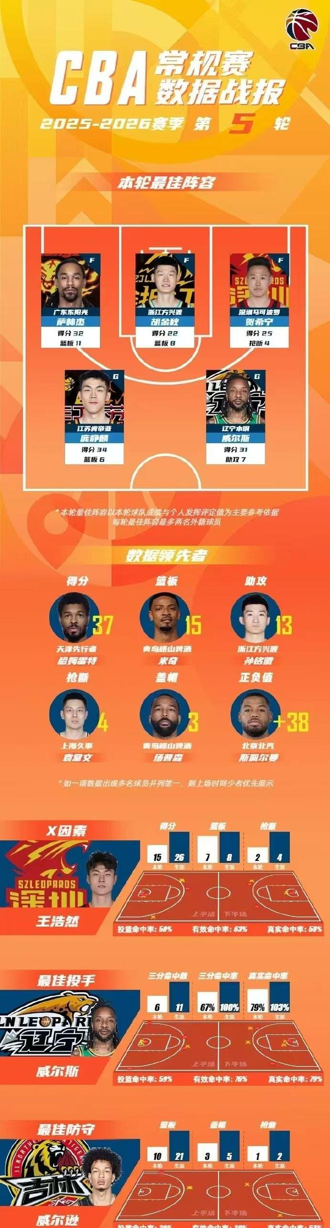 CBA常规赛第5轮最佳阵容:广东萨林杰32分11篮板广厦胡金秋22分8篮板深圳贺希宁25分4抢断江苏庞峥麟34分6篮板辽宁威尔斯31分7助攻新科探花庞峥麟狂轰34+6数据,再度刷新生涯CBA单场最高分纪录,且他最近3场比赛已经两次轰下30+得分,帮助江苏88-84险胜天津收获新赛季首胜,也是被认为年度最佳星锐球员的头号热门人选。萨林杰轰下32+11的两双数据,率领广东93-85战胜广州,豪取开局5连胜领跑。威尔斯贡献31+7数据,率领辽宁98-86战胜北控。