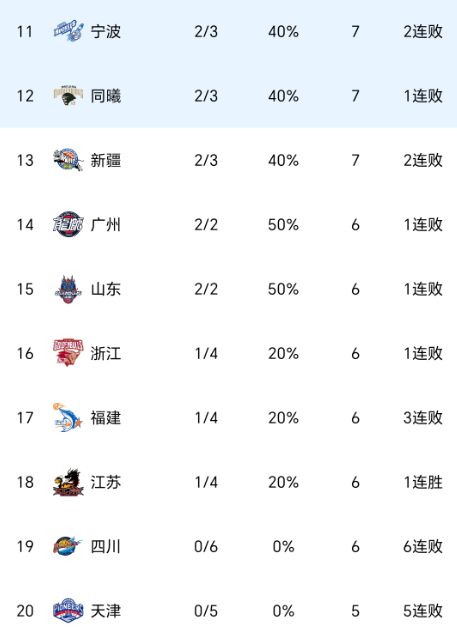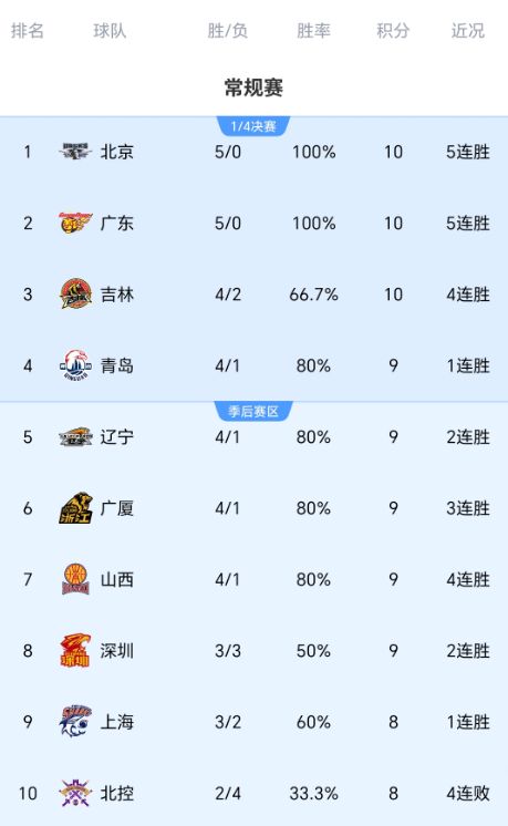 从以上积分榜来看,联盟只有北京队、广东队开局五连胜,吉林队多赛一轮4胜2负升入第三,青岛队、辽宁队、广厦队、山西队都是4胜1负的战绩。此外,全败球队仅剩天津队、四川队。从开局表现来看,吉林队、青岛队、北控队、新疆队的表现最为意外,前面两队不断往上走,后面两队不断往下走。