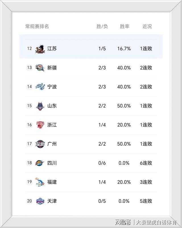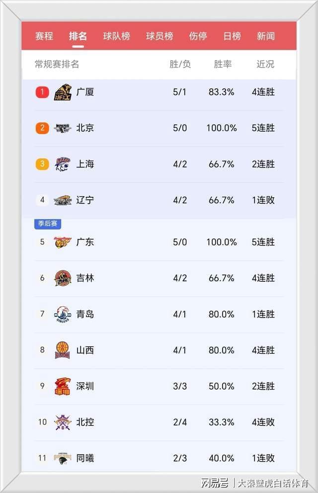 随着两场比赛的先后结束,最新积分榜再次出现变化。由于先赛一轮,卫冕冠军广厦队以5胜1负冲上榜首,北京男篮和广东男篮均5胜0负,但前者依旧高居排名第2,而后者则落后上海和辽宁,只能排在第5位。榜尾方面,5连败的天津男篮排在倒数第一,4负1胜的福建男篮和6连败的四川分列排在倒数二三位。