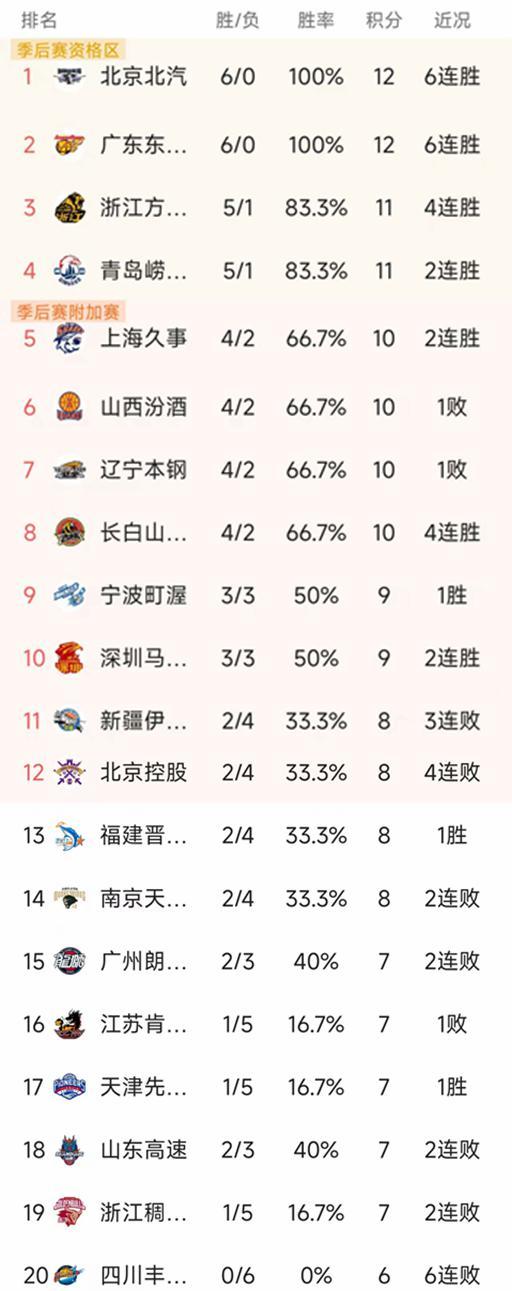 CBA最新积分榜北京和广东组成了第一集团,两支球队豪取6连胜保持不败金身领跑全联盟。北京队昨晚在缺少了周琦的情况下,客场89-85险胜新疆,赵睿战旧主不手软19投10中,三分球7投2中,2罚1中贡献了23分5篮板6助攻,这是他赛季首次得分20+,体现了价值和对老东家全力以赴的尊重。