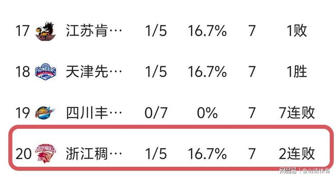 目前,排在积分榜后四位的,分别是江苏队1胜5负,排积分榜倒数第四位;天津队以1胜5负,排积分榜倒数第三位;四川队以0胜7负,排积分榜倒数第二位;浙江队以1胜6负,排积分榜倒数第一位。浙江队开赛至今,仅仅击败福建队,先后不敌辽宁、广东、宁波(双杀)、北京、上海队,与球队赛季前的预期目标相去甚远。