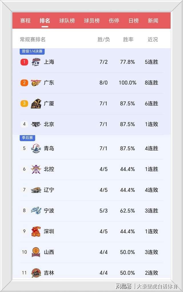 随着这场比赛的结束,辽宁男篮前9轮只拿到4胜5负的战绩,胜率首次跌至五成以下,而拿到5连胜的上海男篮,则是凭借多赛一场的优势,以7胜2负的战绩暂时冲上榜首宝座。