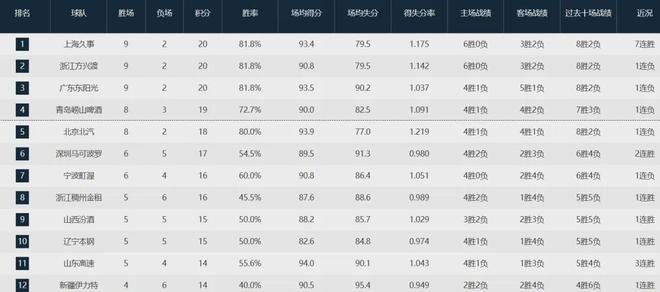 本赛季至今,广东队以9胜2负位列联盟第三,浙江队以5胜6负排名联盟第八。