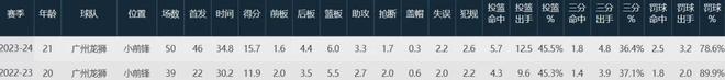 过去崔永熙为广州队出战两年时间里,菜鸟赛季就能场均11.9分5.5板2.7助2断,投篮命中率45.3%;二年级场均15.7分6板3.3助1.7断,投篮命中率45.5%。
