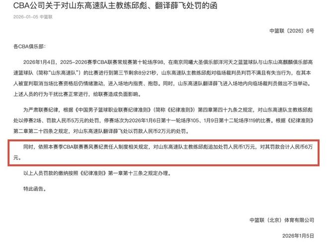CBA官方正式发布通告:山东男篮主教练邱彪,由于在面对南京同曦的比赛中,对临场裁判员判罚不满,且有失当的行为,并且在取消比赛资格后仍有情绪激动的举动,根据纪律准则规定,决定处以停赛2场,外加罚款5万的处罚。此外,根据联赛赛风赛纪责任人的相关规定,对邱彪追加处罚1万,合计罚款6万人民币。