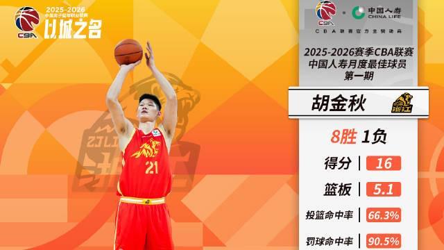 CBA官方写道:浙江广厦篮球俱乐部球员胡金秋本月出战9场,帮助球队取得其中8场胜利,在场均出场25分钟的时间里,能够得到16分、5.1篮板,投篮命中率高达66.3%、罚篮命中率90.5%,且9场比赛胡金秋总共只出现了4次失误。