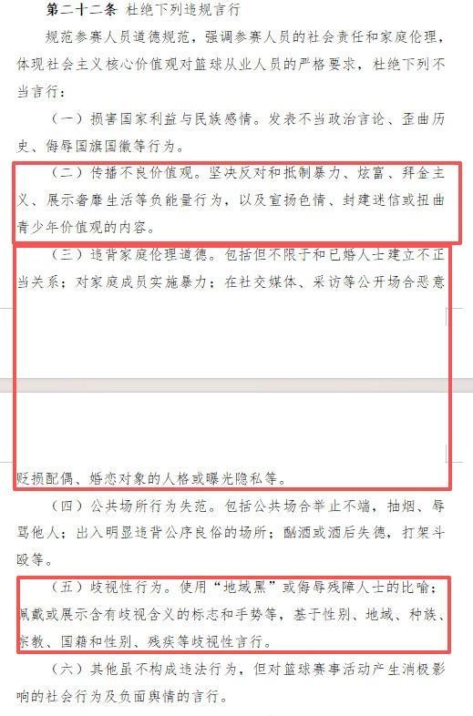 违背家庭伦理道德这些的,让刘维伟,徐杰等上赛季场外闹出花边儿事件的人躺枪,但更重要的是还有一点,不能在网上和球迷们吵架了,这种是属于会对篮球赛事活动产生一些消极影响,还有负面的情况。篮协认为,你天天在网上和人吵架,球迷们肯定也会对你这个联赛产生一些不好的看法和评价。