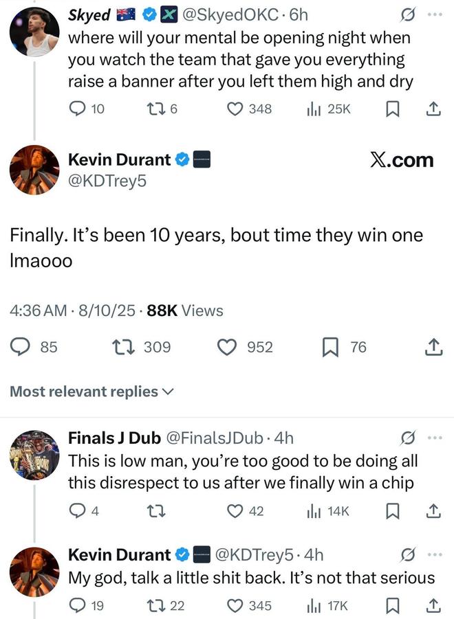 你KD只要随便说两句话,立刻就对他进行直接重罚,因为杜兰特说的那些话,好多都是那种篮协所谓的会造成负面影响的言行。以前有网友喷杜兰特是软蛋,杜兰特回头也喷网友:“你更是软蛋。”有网友说你就是个投敌的人,杜兰特说:“你想投敌都没机会,因为人家不咬你。”就这些话放到CBA联赛里,这不全是违规言论?