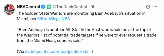 雷速体育10月4日讯 知名NBA账号NBACentral 更新社媒,转发了名记Brett Siegel 有关勇士的报道。NBACentral写道:消息人士透露,勇士正在关注阿德巴约在迈阿密的情况。“消息人士称,阿德巴约如果向迈阿密热火队提出交易请求,他将位列勇士队潜在交易目标名单的首位。”阿德巴约曾两次入选全明星,上赛季场均得到18.1分9.6篮板4.3助攻和1.3次抢断。