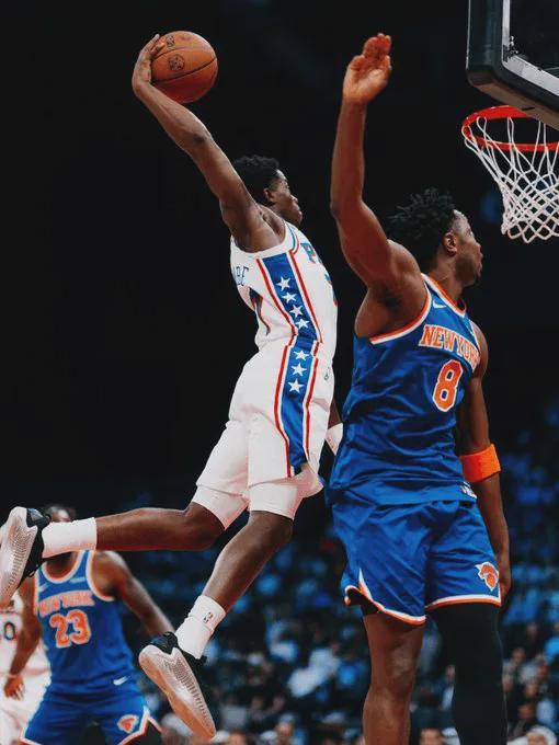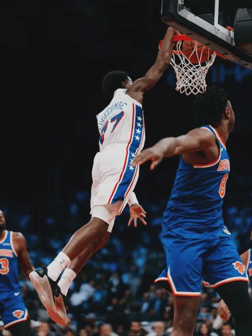 雷速体育10月5日讯 NBA季前赛,76人对阵尼克斯的比赛中。第一节比赛,埃奇库姆接球加速突破,直接起飞完成单臂劈扣。随后,76人官方社媒更新动态,晒出了埃奇库姆比赛炸裂扣篮瞬间。以下为官方晒图: