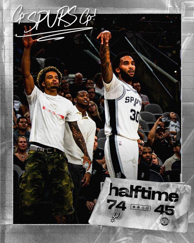 马刺队:文班亚马出战16分钟得到9分10篮板7助攻3封盖6失误,凯尔登16分,尚帕尼16分4篮板,弗拉格勒10分6助攻,布莱恩特15分,科内特16分4篮板。广州队:卡明斯基22分7篮板,奥拉迪波20分5篮板,陈国豪13分3篮板,管子煜6分2篮板2助攻。首节文班亚马在内线给广州队制造了很大的冲击,马刺队内突外投一波8-0后14-8将分差逐渐拉开。广州队卡明斯基的三分,助球队缩小差距。中段过后尚帕尼和沃特斯先后命中三分,马刺将分差拉开到两位数。首节比赛战罢,马刺34-22领先。第二节上来尚帕尼和凯尔登发力,带领马刺打出了15-2的开局,8分35秒马刺49-24领先达到25分。卡明斯基一人连拿7分,扛起广州队进攻,带队将分差追回到20分之内。后半段广州队进攻发力,马刺趁机打出得分高潮扩大分差。半场比赛结束,马刺74-45领先29分。