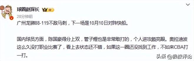 北京时间10月7日,NBA季前赛,广州龙狮88-119不敌马刺,此役奥拉迪波时隔2年重返NBA赛场,代表广州龙狮出战季前赛,登场28分42秒,19投8中,得到20分5篮板3助攻5抢断1封盖,整体表现非常全面,只是三分球投篮命中率尚未开,只交出了8中1的手感。