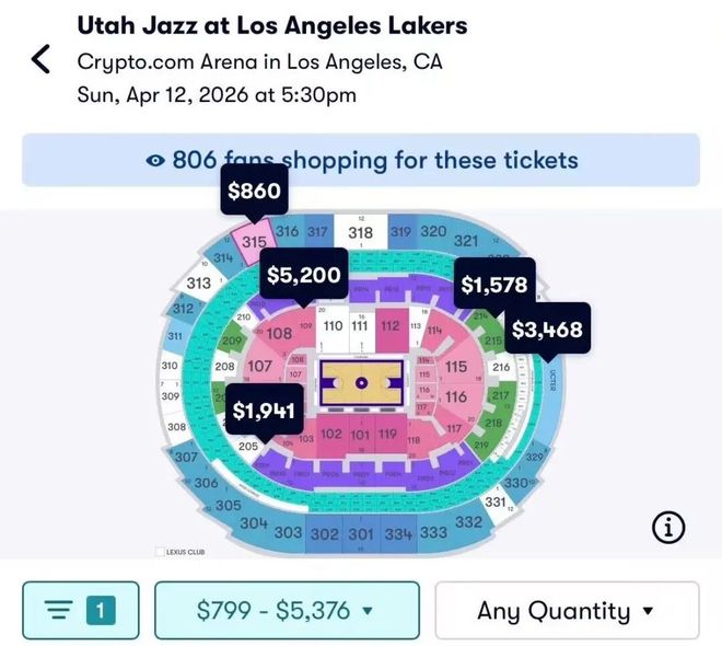 巧合的是,科比退役巡演最后一站打爵士而本赛季,湖人的最后一战对手也是爵士老詹的预告发出后,爵士的最低票价暴涨从85美金一路飙升十倍,现在还在涨价中
