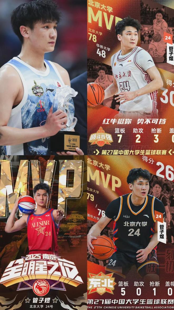 而这一个FMVP,居然只是管子煜最近4个月内拿到的第4个MVP。在今年CBA全明星周末的星锐挑战赛上,管子煜作为大学生联队的绝对核心,全场独得19分8篮板,捧起CBA全明星周末星锐赛的MVP奖杯。