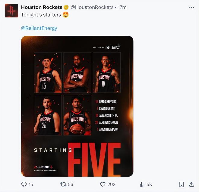 杜兰特迎来火箭首秀进入先发阵容,谢泼德依旧是先发一号位。比赛回顾