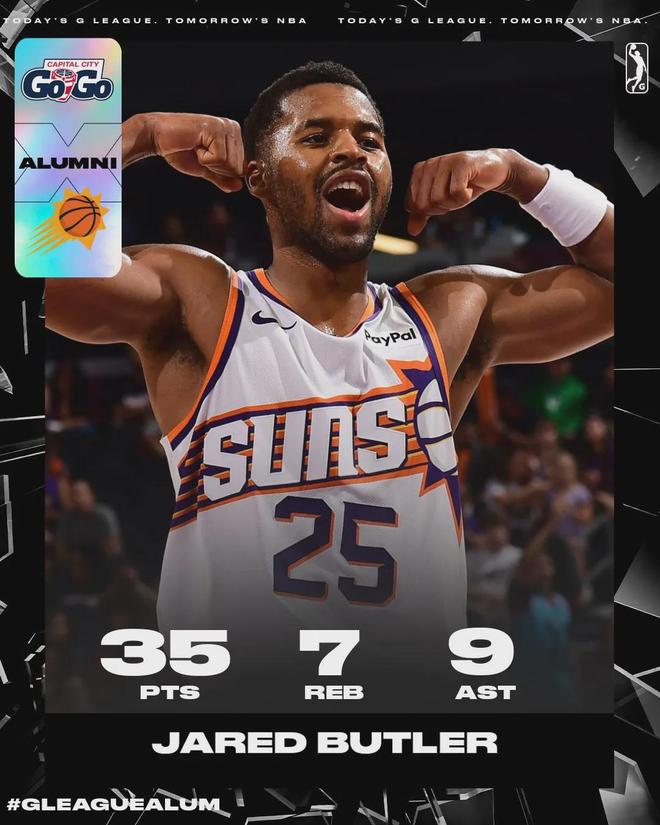 单场35+7+9,而且还是25岁当打之年,贾里德-巴特勒居然连正式合同都拿不到。今年季前赛,他场均出战21分钟,得到15.5分3.3篮板4.3助攻1.8抢断0.5盖帽2失误。投篮命中率47.1%,三分命中率35.3%,罚球命中率66.7%。古德温同样打了四场季前赛,场均出战19分钟,得到12.5分3.3篮板2.3助攻1.8抢断0.3盖帽1.8失误。投篮命中率46.2%,三分命中率38.9%,罚球命中率70%。巴特勒出生于2000年8月25日,比古德温小2岁,而且数据更好点。