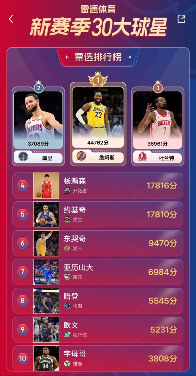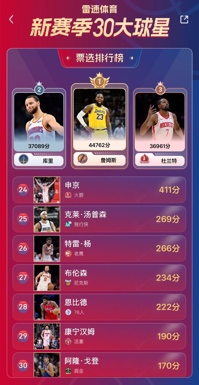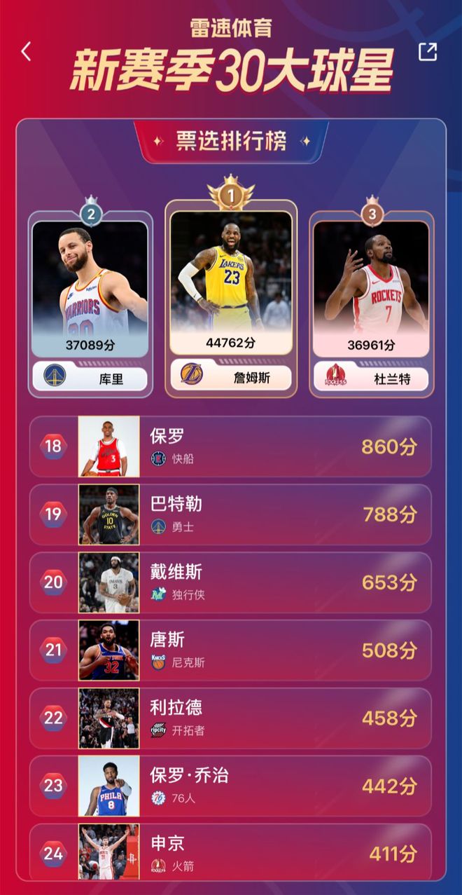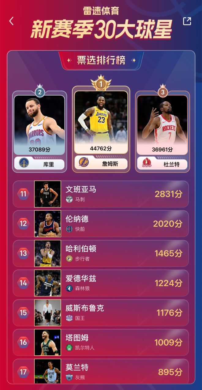 雷速体育10月20日讯 雷速NBA新赛季30大球星活动的第二阶段的竞争已经进入收官阶段,活动就于今日下午14点正式结束。目前雷速NBA新赛季30大球星排名结果如下: 1-10名:詹姆斯、库里、杜兰特、杨瀚森、约基奇、东契奇、亚历山大、哈登、欧文和字母哥。 11-17名:文班亚马、伦纳德、哈利伯顿、爱德华兹、威斯布鲁克、塔图姆和莫兰特。 18-24名:保罗、巴特勒、戴维斯、唐斯、利拉德、保罗·乔治和申京。 25-30名:克莱·汤普森、特雷·杨、布伦森、恩比德、康宁汉姆和阿隆·戈登。各位老哥喜欢的球星分别排名第几?趁着活动时间尚未结束,快来给自己喜欢的球星打上最后一Call,顺便抽一下正品球衣、篮球和球星卡等精美好礼~点击前往活动投票页面>>>点击前往活动投票页面>>>点击前往活动投票页面>>>