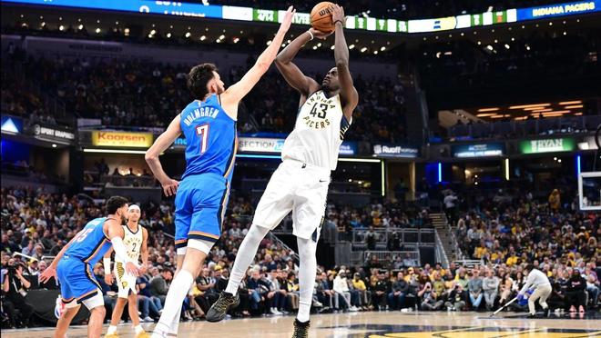 首个加时赛里,托平外线打铁,步行者连续拼抢前场篮板得手,沃克远投不中。托平上篮得分,亚历山大三分球不中,雷霆挑战判罚失败,西亚卡姆2罚1中。沃克抢下前场篮板,马瑟林2罚全中,亚历山大罚中2球还以颜色,霍姆格伦远投打铁,不过随后封盖马瑟林找回颜面。米切尔轰进2+1,沃克高位跳投得分予以回应。亚历山大快速上篮得分,西亚卡姆高难度单打命中还以颜色。米切尔2罚全中,沃克失误,亚历山大中距离得分,马瑟林上篮得手。时间仅剩8秒,亚历山大抛投绝杀不中,双方战成124平。马瑟林防守亚历山大