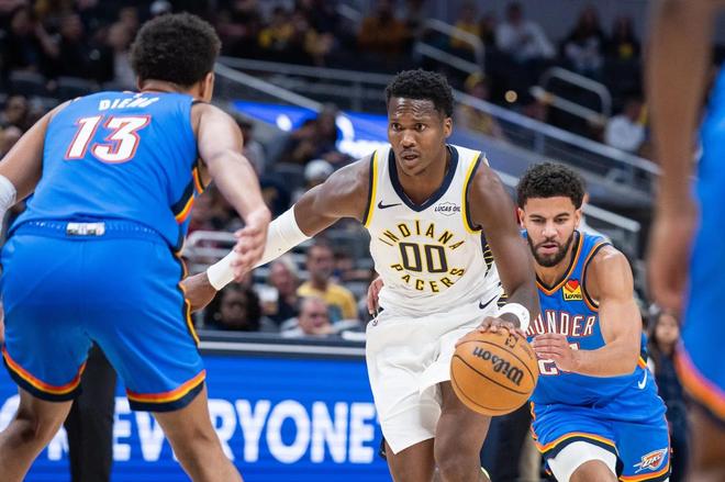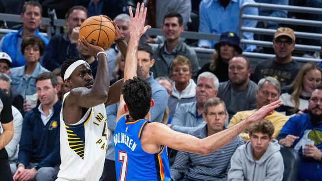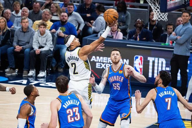 NBA常规赛继续进行,雷霆奔赴客场与步行者展开对决,两队是上赛季总决赛的对手。OKC在揭幕战经历了双加时力克火箭,可谓是士气大振。哈利伯顿因伤赛季报销,印第安纳在休赛期还失去了主力中锋迈尔斯特纳。此役,卡莱尔使用了西亚卡姆、内姆哈德、内史密斯、马瑟林与杰克逊的首发阵容,麦康奈尔伤停。雷霆首发五虎则由亚历山大、霍姆格伦、哈尔滕施泰因、多尔特与维金斯领衔,卡鲁索、杰伦威廉姆斯、华莱士、以赛亚乔缺战。两大劲旅的激烈厮杀,一触即发。亚历山大55+8刷爆纪录还创NBA历史第1神迹,雷霆2连胜!西亚卡姆32+15,马瑟林36+11!全场比赛回顾首节开打,亚历山大2罚1中,霍姆格伦勾手得分,马瑟林2罚全中,随后外线取分还以颜色。亚历山大2罚全中,内史密斯回敬三分球,哈尔滕施泰因勾手得分,西亚卡姆轰进远投。亚历山大罚进2球,西亚卡姆高位跳投得分予以回应。亚历山大失误,随后打成了2+1找回颜面。马瑟林抢下前场篮板并助攻托平暴扣,亚历山大上篮得分,西亚卡姆2罚全中,米切尔补篮打进,多尔特篮下得手。马瑟林防守亚历山大