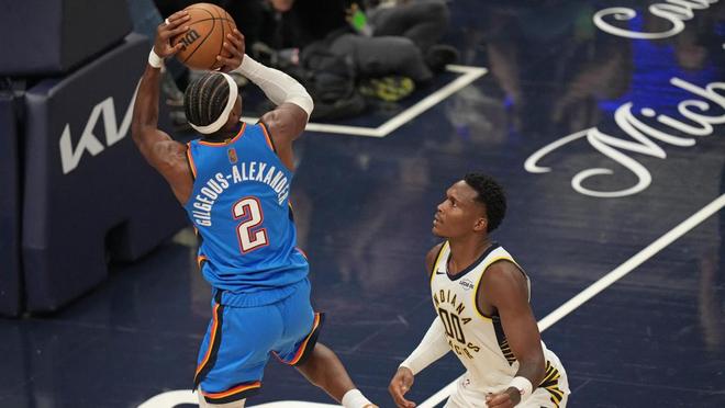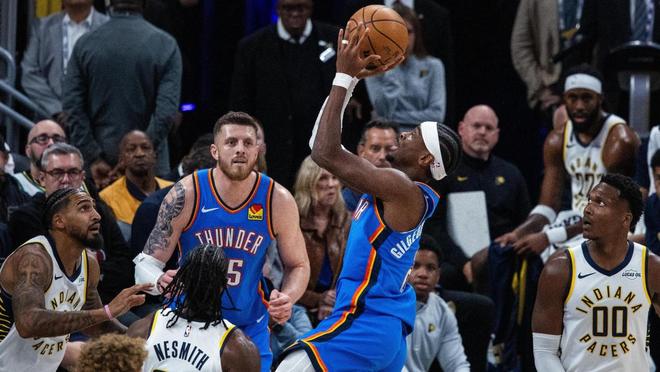 谢泼德轰进远投,西亚卡姆2罚1中,步行者追平比分。哈尔滕施泰因、西亚卡姆各有2罚不中,步行者连续外线打铁,霍姆格伦罚中2球。维金斯轰进三分球,卡莱尔请求暂停,托平2罚全中,亚历山大中距离得分。霍姆格伦2罚1中,托平上反篮得手,米切尔2罚全中,马瑟林暴扣还以颜色。卡莱尔技术犯规,亚历山大罚球命中,米切尔快速上篮得分,马瑟林、亚历山大各有2罚全中。半场打完,雷霆以54比47领先,步行者单节以22比32落后,亚历山大单节砍下了11分。易地再战,内姆哈德肩膀受伤退场,西亚卡姆命中2+1,维金斯轰进三分球,随后送出大帽还以颜色。亚历山大外线打铁,马瑟林上篮得手,雷霆请求暂停。谢泼德抢断多尔特,随后完成暴扣,维金斯罚中4球还以颜色,托平与亚历山大在中距离斗法。赫夫、谢泼德与亚历山大对射远投,巴恩海泽补篮得分。马瑟林命中2+1,托平轰进3分球,多尔特2罚全中,马瑟林再次打成了2+1。亚历山大跳投