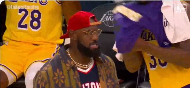 雷速体育10月25日讯 NBA常规赛继续进行,湖人今天在主场迎战森林狼。虽然因为伤病无法出战,但是勒布朗仍然不停和场上的队友交流,积极互动。