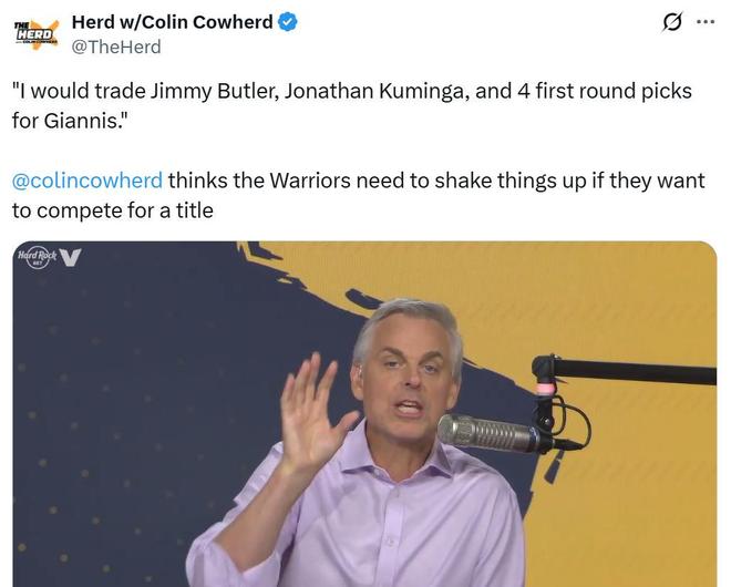 名嘴支招勇士队抢人面对这样的局面,FOX体育名嘴Colin Cowher也在节目中建议勇士队在交易截止日前尝试通过6换1交易追求字母哥,以帮助库里全力争夺第五个冠军。