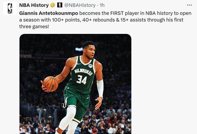 字母哥成历史首人字母哥如此神奇的表现,也是其开赛至今夸张表现的缩影,新赛季至今3场比赛,字母哥一共砍下108分48篮板21助攻,场均36分16板7助。成为NBA历史上首位在开季前三场拿下至少100分40篮板15助攻的球员。