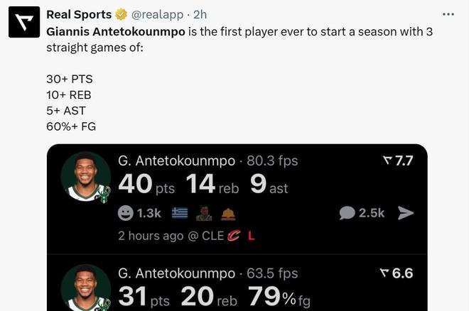 更为夸张的是,字母哥连续三场比赛在交出华丽数据的同时,还保持着超过60%的进攻效率。这让其成为NBA历史上首位在开季前三场至少以60%命中率拿下至少30分10篮板5助攻的球员。