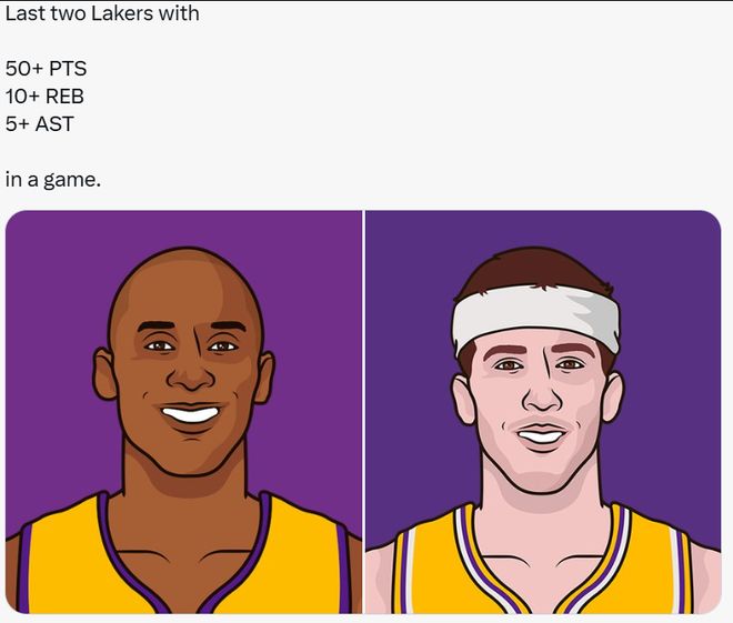 第十一,里夫斯成为了湖人队史第12个50+先生,前11个分别是乔治-麦肯、埃尔金-贝勒、鲁迪-拉鲁索、杰里-韦斯特、张伯伦、盖尔-古德里奇、塞德里克-塞巴洛斯、奥尼尔、科比、詹姆斯、安东尼-戴维斯。