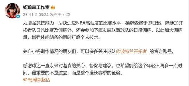 随后,@杨瀚森工作室发布声明:为增强竞技能力,尽快适应NBA高强度的比赛水平,杨瀚森将于即日起,除参加开拓者队日常比赛及训练外,还会参加下属发展联盟球队的日常训练,以此加大训练量,增强体能储备的同时打磨个人技术。感谢球迷一直以来对瀚森的关心、督促与建议,也希望能给这个年轻人再多一点时间。最重要的不是过去,而是整个漫长赛季的征途。