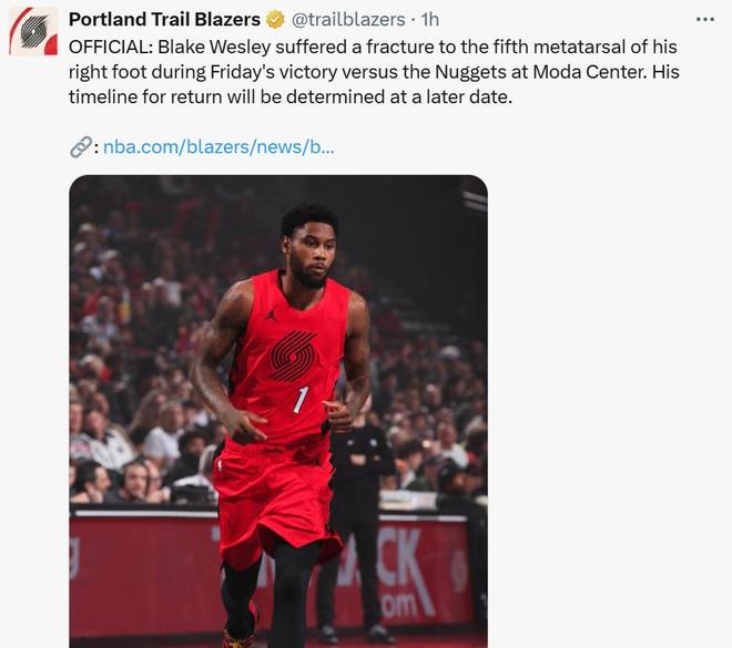 细节三:开拓者队伤病爆发在球队积极培养杨瀚森的同时,新帅斯普利特长时间使用5小的策略弊端也暴露,开拓者队伤病隐患逐渐爆发。继利拉德(左跟腱撕裂)、亨德森(左腿筋撕裂)和塞布尔(左手拇指尺侧副韧带撕裂)后,韦斯利又遭遇右脚第五跖骨骨折,四人将长期缺席。同时在对阵湖人前,开拓者也更新伤病名单,克里斯-穆雷和罗威目前是每日观察状态。