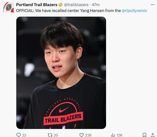 杨瀚森官宣被召回根据开拓者队官方宣布,球队已经将杨瀚森从发展联盟召回,在对阵湖人之前重新回到球队之中。