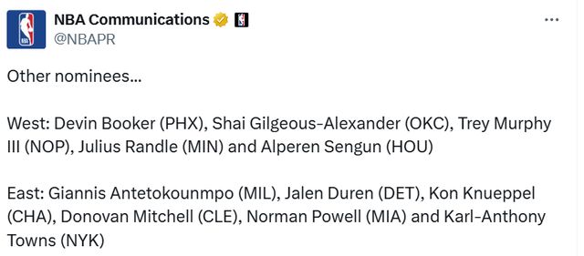 西部:布克(太阳)、亚历山大(雷霆)、墨菲(鹈鹕)、兰德尔(森林狼)、申京(火箭)东部:字母哥(雄鹿)、杜伦(活塞)、克努佩尔(黄蜂)、米切尔(骑士)、鲍威尔(热火)、唐斯(尼克斯)